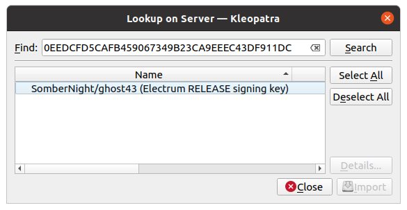 I remember that I had error importing an asc not long ago because I've pressed right-click/save as and the saved file was not the expected asc, instead it was a html although the filename was asc. So.. double check before importing! Even more, if you want all nice and green, as a second step inside Kleopatra you could create a temporary certificate for yourself and (right click) certify the keys you've imported. Title: Re: ThomasV public key Electrum Post by: o_e_l_e_o on July 04, 2022, 04:12:05 PM Code: gpg --keyserver keys.gnupg.net --recv-keys 6694D8DE7BE8EE5631BED9502BD5824B7F9470E6 Code: keyserver.ubuntu.com You'll also want to repeat the command to import the keys of SomberNight and Emzy as well. The fingerprints for their keys are as follows: SomberNight Code: 0EEDCFD5CAFB459067349B23CA9EEEC43DF911DC Code: 9EDAFF80E080659604F4A76B2EBB056FD847F8A7 Title: Re: ThomasV public key Electrum Post by: nc50lc on July 05, 2022, 03:38:39 AM -snip- If I try to look it up on server it does not find it. Kleopatra's default 'OpenPGP Keyserver' (hkps.pool.sks-keyservers.net) seems to be offline as well.You can change it to keyserver.ubuntu.com in "Settings->Configure Kleopatra..." > "Open PGP Server:" in 'Directory Services' tab. You can use other servers but that's the most recommended one. After that, "Lookup on Server..." should work again. Title: Re: ThomasV public key Electrum Post by: NotATether on July 05, 2022, 04:15:43 AM The SKS keyserver network has been deprecated, so the server keys.gnupg.net will no longer work. You could try either of the following instead: Code: keyserver.ubuntu.com So that is why most of my attempts to stake PGP keys on the gnu keyserver were all failing. I believe keys.gnupg.net is still the default keyserver for gnupg?? Title: Re: ThomasV public key Electrum Post by: DireWolfM14 on July 05, 2022, 05:39:45 PM I believe keys.gnupg.net is still the default keyserver for gnupg?? I don't think so. Recent releases of Kelopatra seems to be using hkps://keyserver.ubuntu.com/ as the default server, which is my favorite to use. It seems to be the most reliable and responsive. I've had good luck with hkps://keys.openpgp.org/ as well. The GnuPG core service doesn't actually have any defaults set, as far as I can tell. It's supposed to search a bunch of servers by default, although I seem to recall reading that specific key servers can be set as defaults in one of the configuration files. I've never messed with it though, so I'm not sure. Title: Re: ThomasV public key Electrum Post by: BitMaxz on July 05, 2022, 11:58:25 PM The SKS keyserver network has been deprecated, so the server keys.gnupg.net will no longer work. You could try either of the following instead: Code: keyserver.ubuntu.com After several attempts old version of GPG4win or the newest version in Kleopatra, I can't seem to make it work when trying to use the lookup on the server. It's loading and nothing comes up. The only works for me are by using a command prompt and send this command Code: gpg --keyserver keys.gnupg.net --recv-keys 6694D8DE7BE8EE5631BED9502BD5824B7F9470E6 Also, those two server works through command. This is the audit log from Kleopatra after verifying signature and Electrum installer Code: gpg: Signature made 28/05/2022 9:03:12 pm Malay Peninsula Standard Time Title: Re: ThomasV public key Electrum Post by: JaimeAlejandro on July 06, 2022, 05:04:11 AM Thank you for the responses. There are many issues with this Gpg4win software. First, language selection does not work. If I choose English instead of Spanish (I live in Spain), it does not matter, the interface is always in Spanish. Second, if I uninstall it and I install again, choosing English, same result. I have now installed and I have two programs: Kleopatra and GPA. Any of them do anything at all when importing or clipping to the clipboard the signatures or keys or whatever.