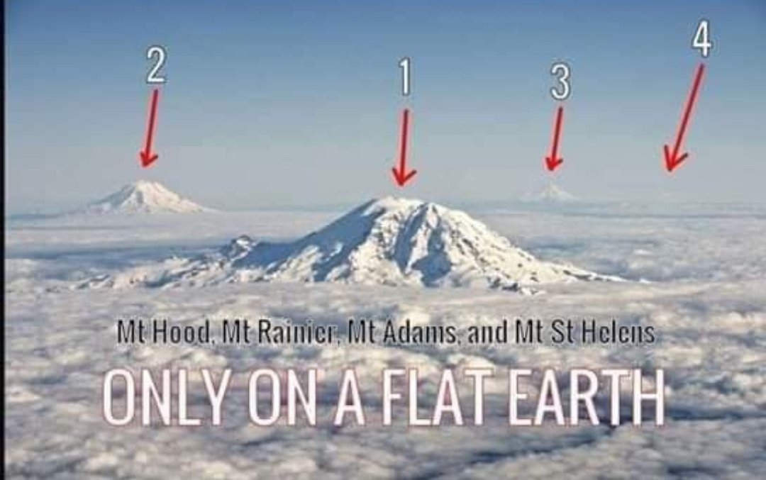 Distance proofs make the FlatEarth irrefutable. Mt. Hood and Mt. St. Helens are 189 miles apart, but can both be seen here. That's 9,000 feet of missing curvature.