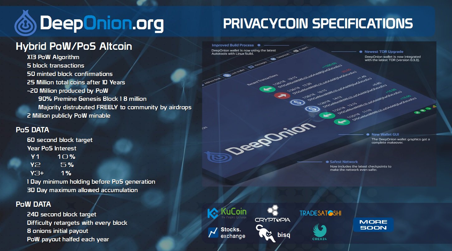Eveneing all my new DeepOnion Coin Specifications Poster with latest trading exchanges Great technology with DeepVault copyrighting app plus latest Tor V0.3.3 privacy features including OBFS4 + Meek Protocols and with excellent PoW staking $Onion interest https://twitter.com/ceredigionman/status/974337194335883264
