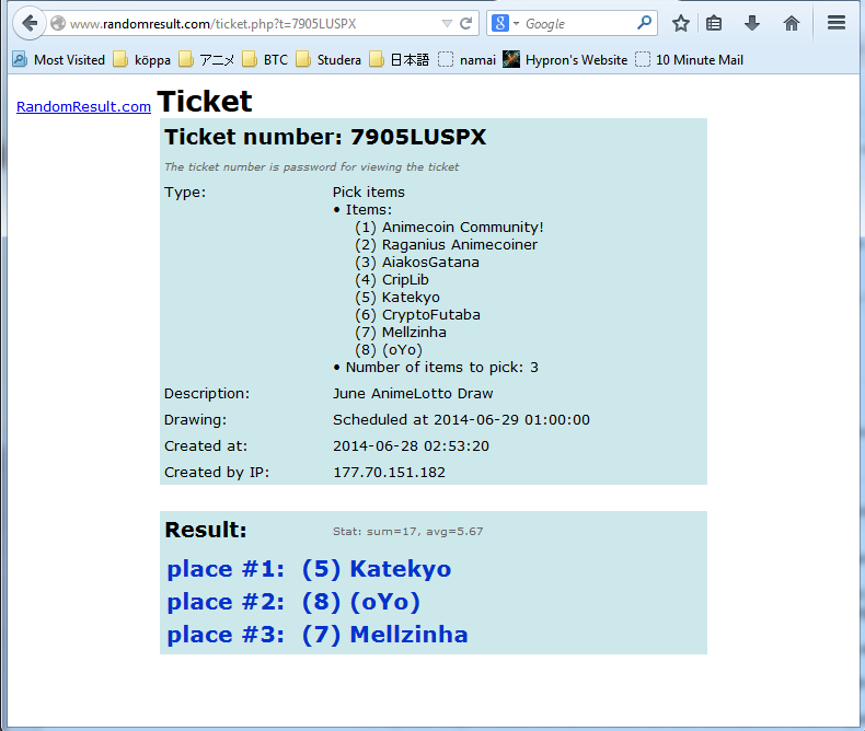 Before that, next Saturday (28th), the link to the ticket created with the list of donors that will be participating in the draw (to be created at http://www.randomresult.com/ticket.php with all those who will have donated until the limit date of June 27th, next Friday) will be published in a post here at our community thread, and also at http://animecoiner.blogspot.com.